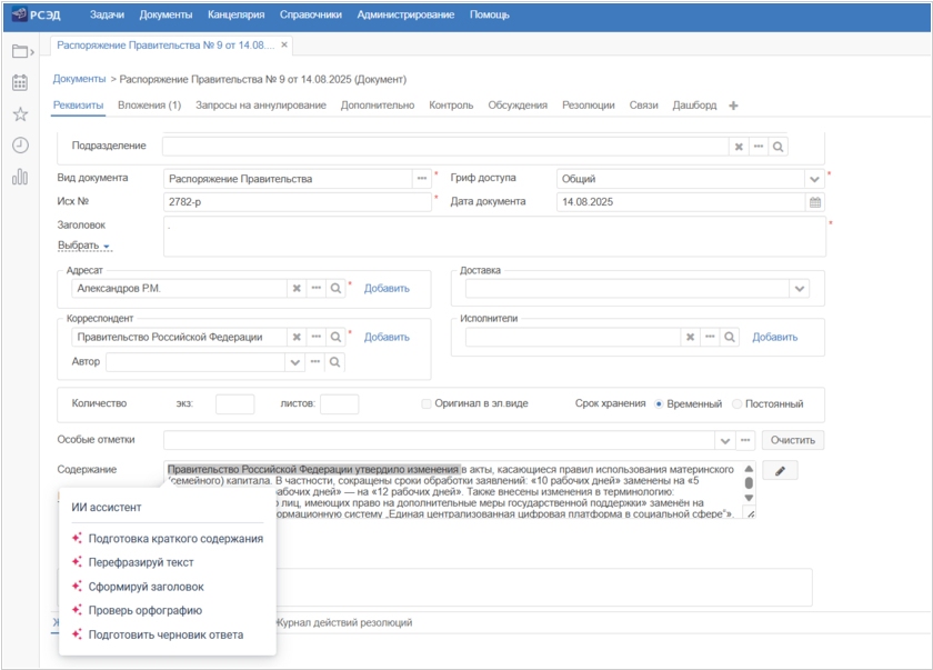 СЭД ТЕЗИС представила новую версию государственной сборки системы электронного документооборота — ГосТЕЗИС 4.3.0. Главное обновление — появление ИИ-Ассистента, интеллектуального помощника, встроенного в систему. Он автоматизирует рутинные операции, помогает работать с текстами и вложениями, формировать аннотации и резолюции, проверять орфографию, переводить документы и искать информацию по смыслу через встроенный чат-бот. Это делает работу с документами быстрее, удобнее и эффективнее. ИИ-Ассистент позволяет взаимодействовать с крупными языковыми моделями через встроенный чат-бот (например, YandexGPT,GigaChat (Сбер), Groovy-скрипт, Llama.cpp-совместимая, Vllm, Ollama). Заказчик может выбрать любую языковую модель, основываясь на задачах организации, требованиях службы безопасности и других критериях.